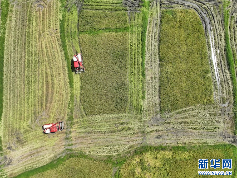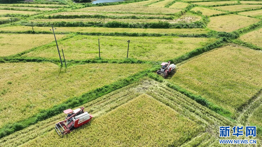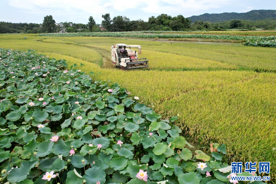 近日,在萍乡市芦溪县芦溪镇葛溪村,大型收割机在田间来回作业。新华网发 王强 摄
