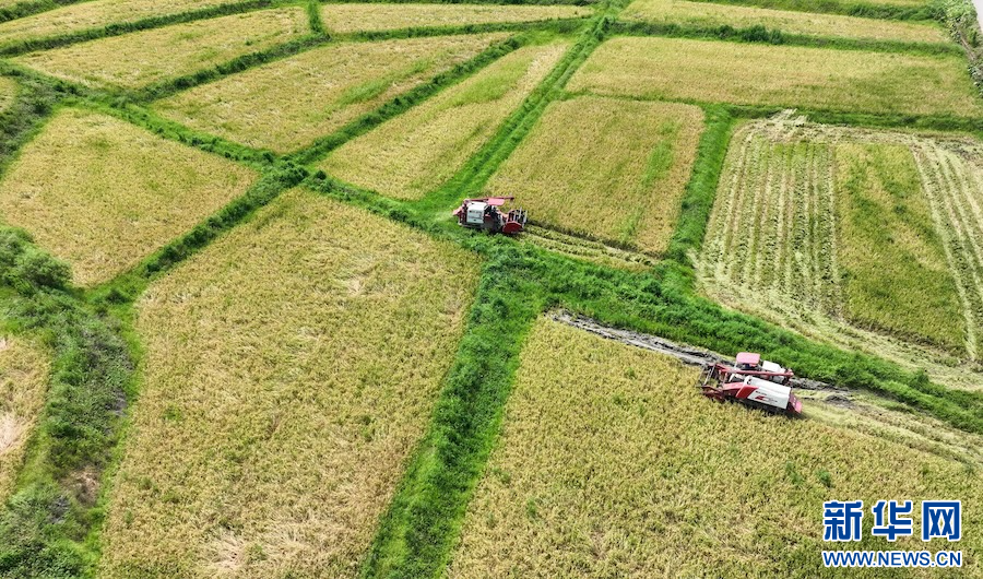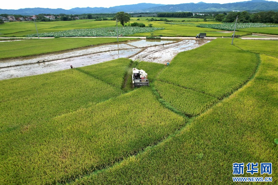 7月17日,在江西省萍乡市湘东区排上镇荷塘村,农机手正驾驶收割机在稻田中穿梭往返忙碌作业。新华网发 李桂东 摄
