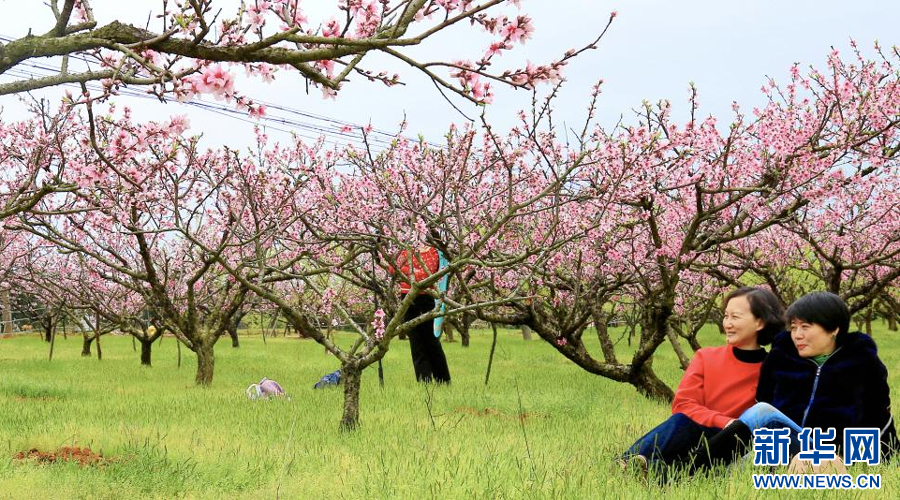 游人们在桃花园内踏春赏花。新华网发