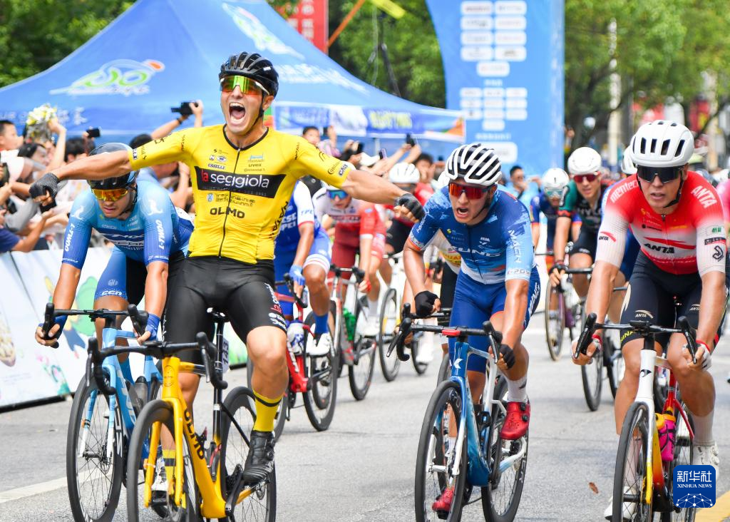 9月19日,意大利格拉尼亚诺体育会车队车手卡塔尔多(前)率先冲过终点,获得赛段冠军。新华社发(许南平 摄)