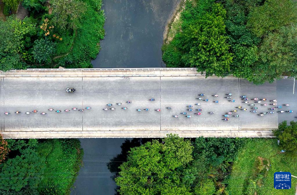 9月19日,参赛选手在比赛中骑行(无人机照片)。