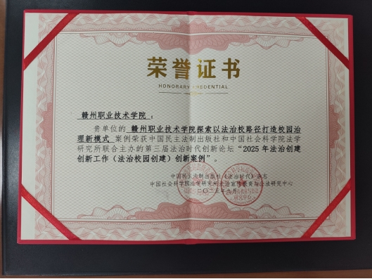 长期以来,赣州职业技术学院始终坚持将法治教育融入人才培养全过程,积极探索具有职业教育特色的法治育人模式。此次获奖既是对该校法治建设工作的肯定,更是对未来工作的鞭策。赣州职业技术学院将以此次获奖为契机,持续深化法治校园创建工作,为培养德智体美劳全面发展的法治素养人才贡献更大力量。(温春燕)