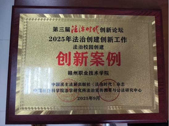 9月20日,由中国民主法制出版社联合中国社会科学院法学研究所主办的第三届法治时代创新论坛暨全民普法40周年研讨会在北京隆重举行。赣州职业技术学院申报的法治创新案例经过专家评审委员会严格遴选,成功入选“2025年度法治创新案例”,并被授予“法治校园创建创新案例”荣誉称号。