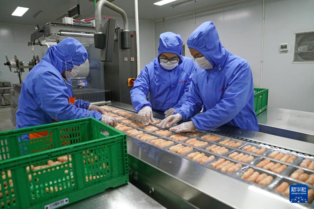在位于江西省修水县港口镇红苏村的幕村杭猪加工基地,在基地工作的村民在摆放猪肉制品(12月3日摄)。新华社记者 万象 摄pagebreak