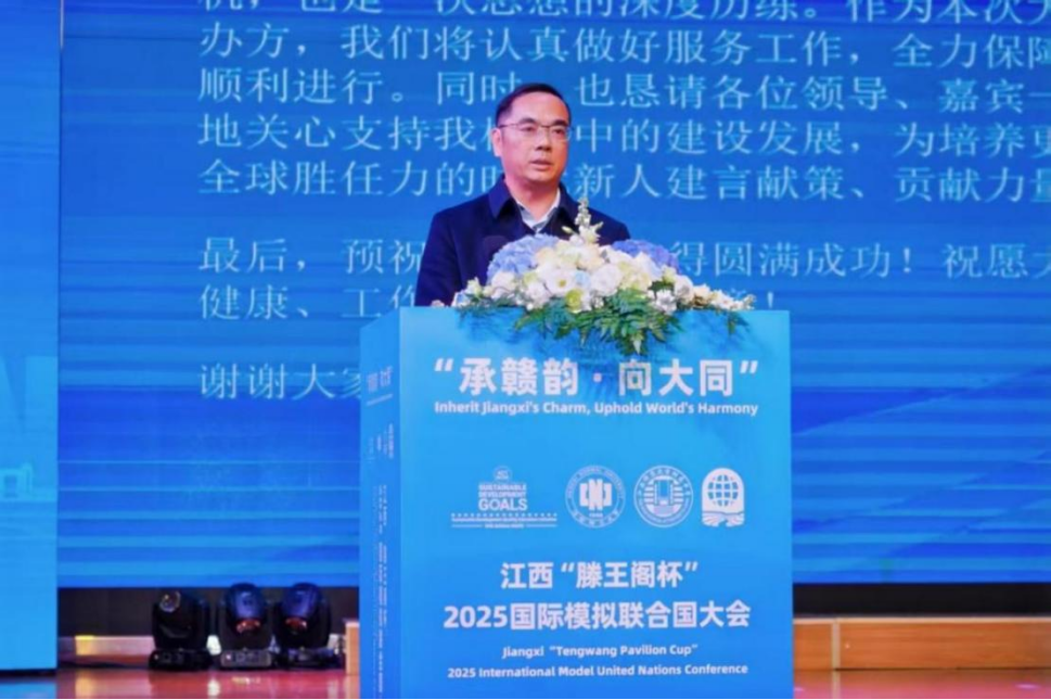 陈晓通代表江西省教育厅对大会的召开表示热烈祝贺,并向全体参会师生与国际友人致以诚挚欢迎。他指出,模联是青年学子拓展视野、锻炼思辨能力的重要平台,期待中外青年通过沉浸式参与,凝聚共识,展现担当。他强调了江西深厚的开放底蕴和滕王阁的文化象征,并表示江西将持续深化教育对外开放,帮助青年成长为兼具家国情怀与全球视野的时代新人。