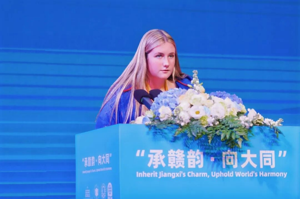 来自美国宾夕法尼亚州Conwell-Egan Catholic High School的Jessica Anne Naphy作为美国学生代表发言,她表达了对重返南昌的喜悦和亲切感,认为模联活动打破了地域壁垒,促进了跨文化友谊。她回顾了去年参会时受到的温暖欢迎,强调模联不仅是学术体验,更是建立直接联系、深化对中国文化感知的机会。她鼓励代表们通过沟通与共情,珍惜这份全球互联的宝贵财富。