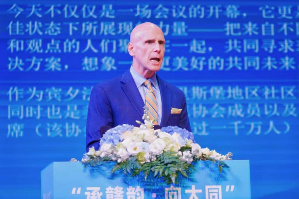 Dr. John Sygielski在发言中分享了教育在连接国际交流中的角色,认为模联不仅是模拟,更是训练青年外交技能的实景练兵场。他指出,面对气候变化、人工智能等复杂议题,要学习如何以尊重的方式辩论、以体面的方式表达不同意见,并理解不同于自身的视角。