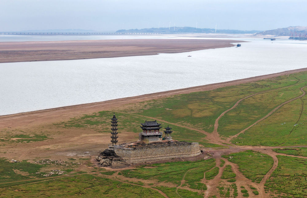 鄱阳湖水位下降,湖区的千年石岛落星墩完全展露出来(2025年12月13日摄,无人机照片)。新华社发(韩俊烜 摄)