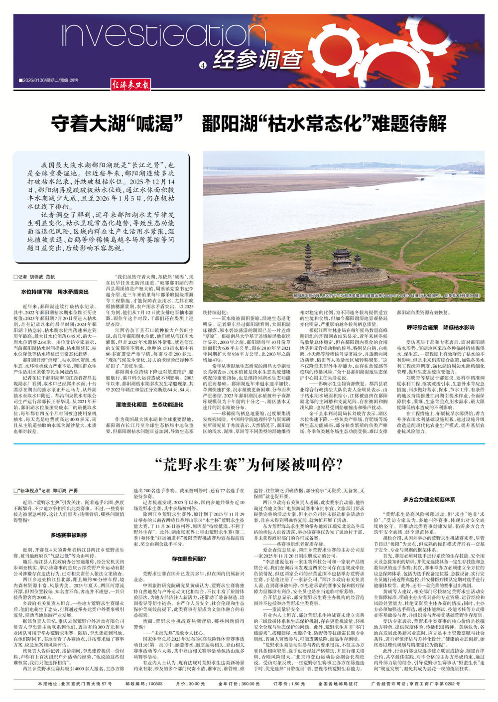 我国最大淡水湖鄱阳湖既是“长江之肾”,也是全球重要湿地。但近些年来,鄱阳湖连续多次打破枯水纪录,并跌破极枯水位。2025年12月14日,鄱阳湖再度跌破极枯水位线,通江水体面积较丰水期减少九成,且至2026年1月5日,仍在极枯水位线下徘徊。