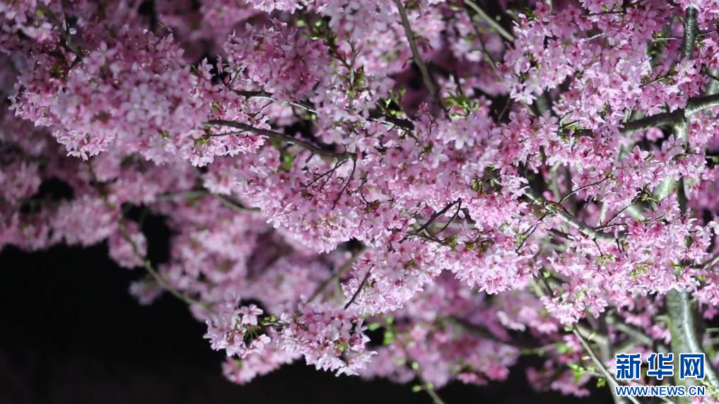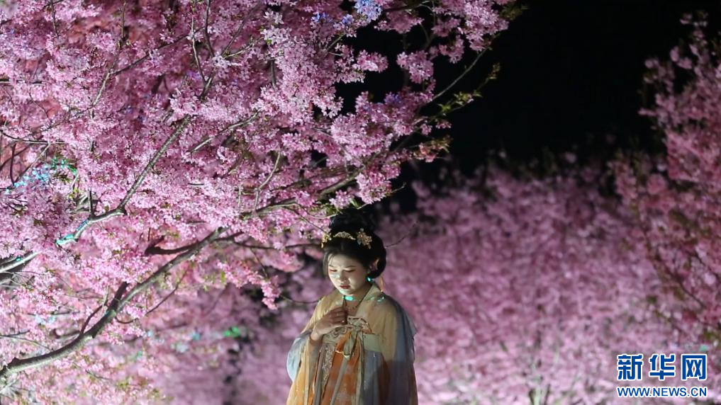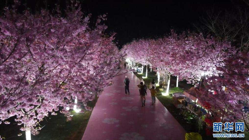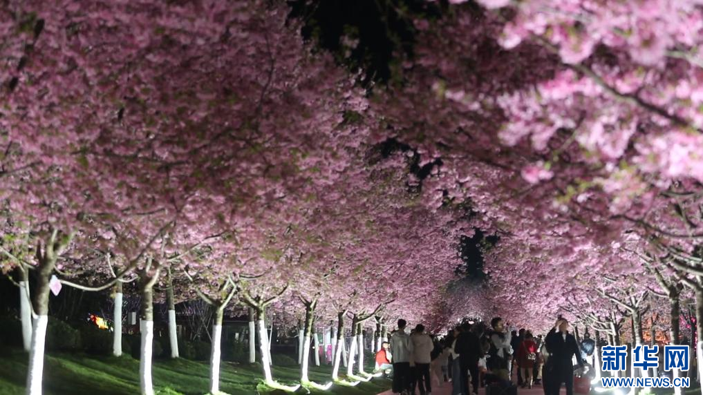 春意盎然,花开似海。随着气温回升,江西南昌凤凰沟景区千亩樱花竞相绽放。今年该景区创新推出樱花夜赏模式,灯光温柔勾勒花枝,既保留樱花原生之美,又让樱林在夜色中层次分明、如梦似幻。夜色中,樱花在暖粉、柔白、浅金等低饱和柔光映衬下愈发显得温婉可人。微风拂过,落樱纷飞,为蜿蜒的步道铺上一层柔软的花毯。游客们三五成群,或驻足花下静静观赏,或举起相机定格美好瞬间。(虞亮亮)