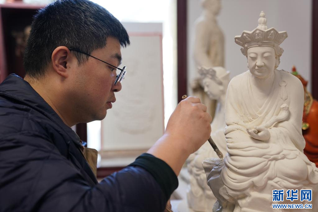 曾锐在工作室修饰“无语佛”的复制品(3月12日摄)。