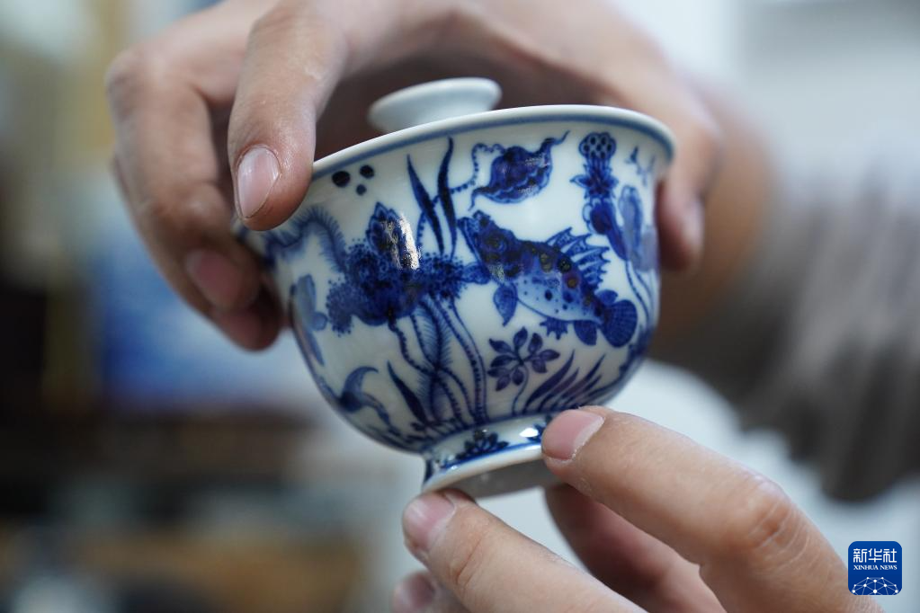 曹浪展示融入油画技法创作的青花瓷茶具(3月11日摄)。新华社记者 周密 摄