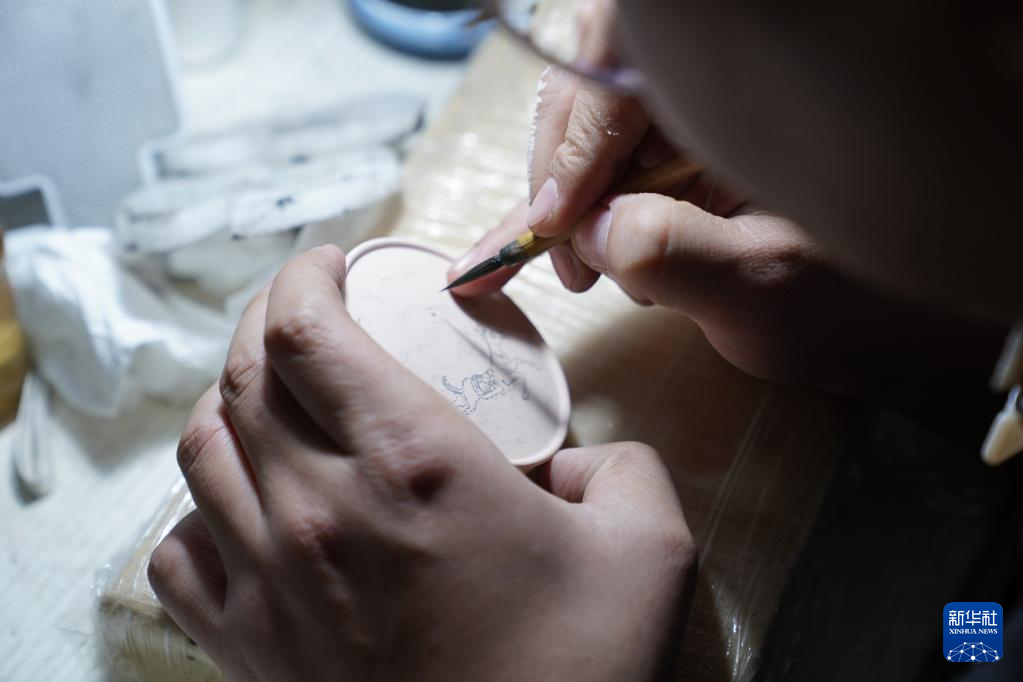 曹浪在创作青花瓷(3月11日摄)。新华社记者 周密 摄