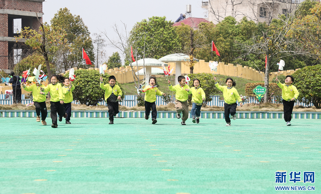 4月2日,小朋友在江西余干县实验幼儿园放飞纸鸢。新华网发 韩海建 摄