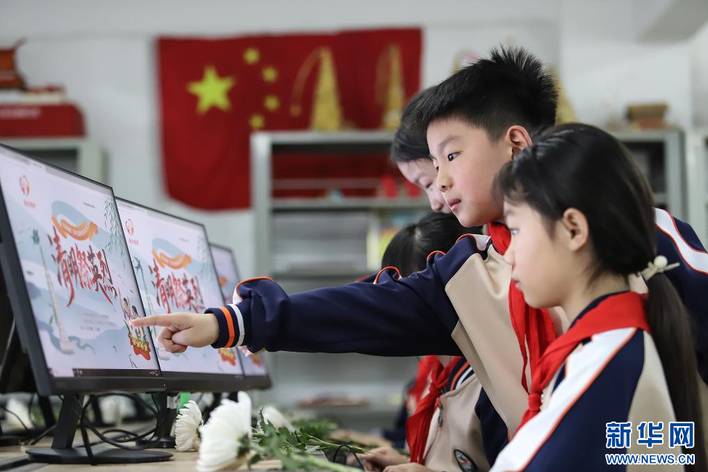 在江西余干县第六小学,同学们通过网络祭奠英烈。新华网发 韩海建 摄