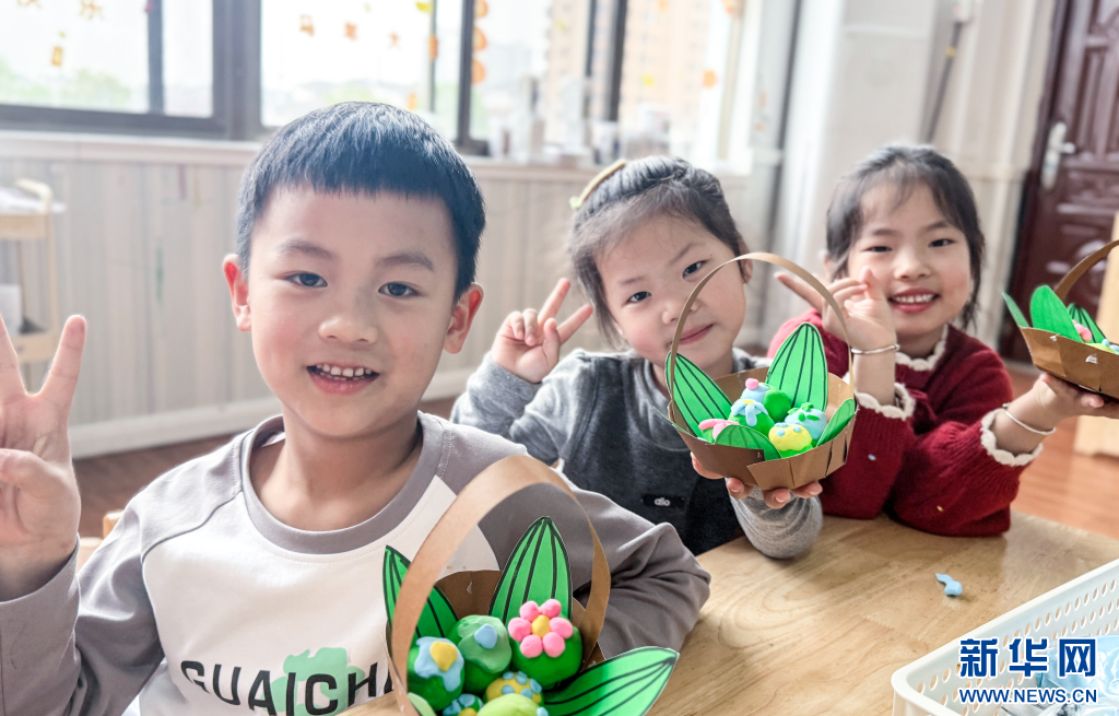 4月2日,在江西余干县第七幼儿园,小朋友展示制作好的手工青团。新华网发 韩海建 摄