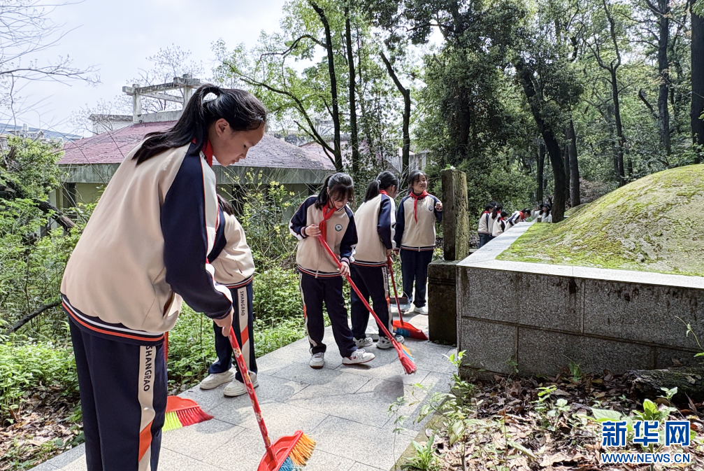 4月1日,江西余干县第五小学的同学们来到余干县东山岭烈士陵园祭扫。新华网发 韩海建 摄