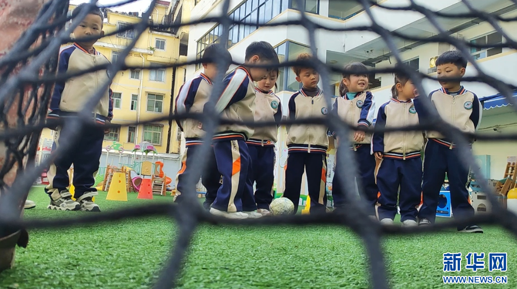 4月2日,在江西余干县第一幼儿园,小朋友们正在进行蹴鞠游戏。新华网发 韩海建 摄